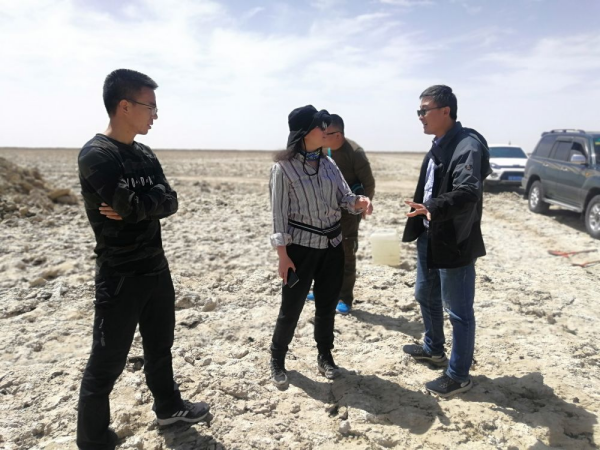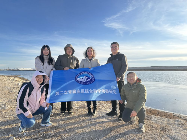 2024年11月25日,王建萍(右三)和科研團隊在鹽湖進(jìn)行野外考察。