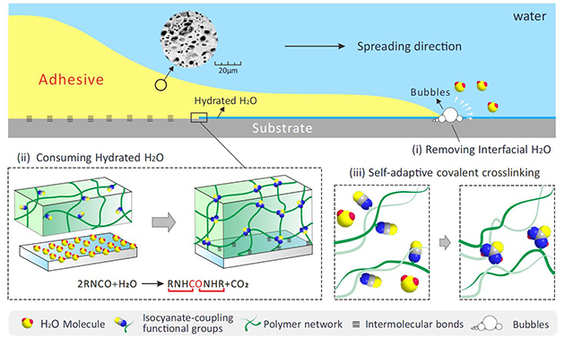濕黏附在機(jī)械工程、海洋技術(shù)和醫(yī)療科學(xué)等領(lǐng)域發(fā)揮著重要作用。然而,在固-固界面含水粘接過程中,水分子的存在極易導(dǎo)致粘合失效,這主要是因?yàn)榻缑嫠璧K了膠黏劑與基材之間的接觸和分子間相互作用的形成。對(duì)于界面水的去除,研究人員已進(jìn)行了各種嘗試,如界面吸水、疏水排斥和擠壓,但這些方法并不能實(shí)現(xiàn)界面水的完全去除,很難保證界面的高性能黏附。