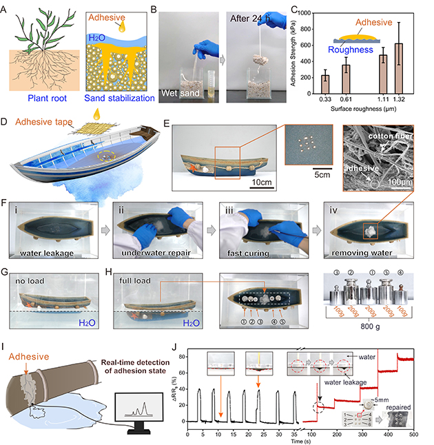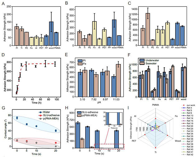 SLU-adhesive表現(xiàn)出優(yōu)異的水下黏附性能和廣泛的基材適用性,在淡水、海水和不同pH水體環(huán)境(pH=3至11)中,均實(shí)現(xiàn)了從無機(jī)到有機(jī)材料表面的高性能黏附,其峰值超過1600kPa。良好的黏附性能和無外界能量輸入的自適應(yīng)增強(qiáng)特性,使SLU-adhesive在水下固沙、水下修復(fù)甚至黏附故障檢測(cè)方面展現(xiàn)出巨大的應(yīng)用潛力。
