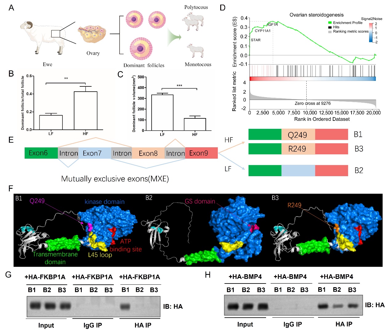 中國科學(xué)院西北高原生物研究所動物生態(tài)與資源保護研究團隊針對綿羊重要繁殖性狀(產(chǎn)羔數(shù)和產(chǎn)羔間隔),以連續(xù)三個產(chǎn)羔季節(jié)產(chǎn)多胎(每胎產(chǎn)兩羔或三羔,HF)和產(chǎn)單胎(每胎產(chǎn)一羔,LF)的藏羊為研究對象,整合全基因組關(guān)聯(lián)分析、普通轉(zhuǎn)錄組學(xué)、單細胞轉(zhuǎn)錄組學(xué)、蛋白質(zhì)組學(xué)和代謝組學(xué)等多組學(xué)研究方法,結(jié)合KASP基因分型、實時熒光定量PCR、酶聯(lián)免疫吸附實驗、免疫共沉淀和蛋白質(zhì)免疫印跡等分子功能驗證實驗,挖掘藏羊產(chǎn)羔數(shù)和產(chǎn)羔間隔關(guān)鍵調(diào)控元件并揭示其高繁殖力的遺傳調(diào)控機制。全基因組關(guān)聯(lián)研究表明,BMPR1B基因與產(chǎn)羔數(shù)性狀相關(guān),PAPPA基因與產(chǎn)羔間隔性狀相關(guān)。首次構(gòu)建了藏羊卵巢單細胞圖譜,發(fā)現(xiàn)關(guān)鍵基因PAPPA特異性表達在壁層顆粒細胞亞群,且BMPR1B基因在壁層顆粒細胞和固醇生成顆粒亞群高表達?;趩渭毎D(zhuǎn)錄組學(xué)、蛋白質(zhì)組學(xué)和代謝組學(xué)整合分析,發(fā)現(xiàn)PAPPA是刺激卵巢優(yōu)勢卵泡生長發(fā)育和類固醇生成的關(guān)鍵候選基因。繁殖主效基因BMPR1B除了非同義突變,首次在藏羊中發(fā)現(xiàn)BMPR1B還存在可變剪接事件調(diào)控多胎性狀。該研究結(jié)果對分子精準選育提升藏羊繁殖力和實現(xiàn)藏羊產(chǎn)業(yè)提質(zhì)增效具有重要意義。
