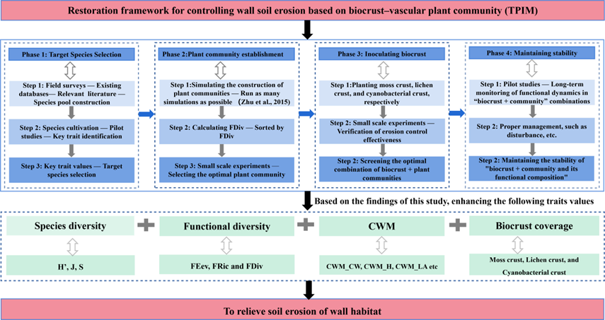 研究發(fā)現(xiàn),維管束植物物種豐富度、物種多樣性、功能豐富度、群落加權(quán)平均和苔蘚結(jié)皮蓋度由土長城遺址頂部向下部顯著降低,且與土長城兩側(cè)土體侵蝕程度呈負相關(guān)(圖1),表明土長城本體較高的區(qū)域有利于維管束植物和生物結(jié)皮的定殖和生長。同時,維管束植物和生物結(jié)皮的協(xié)同作用能有效緩解遺址本體遭受風(fēng)雨侵蝕(圖2)?;诖耍芯咳藛T提出了基于生物結(jié)皮和維管束植物群落構(gòu)建目標(biāo)物種選擇、植物群落構(gòu)建、生物結(jié)皮接種和維持群落穩(wěn)定等增強土長城抗侵蝕的“修復(fù)框架”(圖3),為土長城遺址本體侵蝕防治提供了新思路。