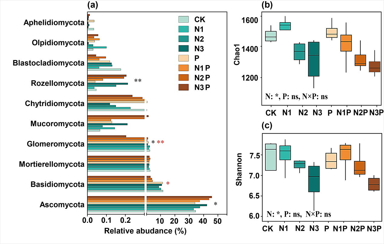 圖1 氮和磷添加對(duì)優(yōu)勢(shì)真菌類群相對(duì)豐度 (a)、真菌 Chao1 豐富度 (b) 和真菌Shannon多樣性 (c) 的影響。 (a)中的黑色和紅色*分別表示氮添加和磷添加的影響。 (b,c) 中的 N、P 和 N × P 顯示了氮添加和磷添加及其交互作用對(duì)真菌群落多樣性的影響。