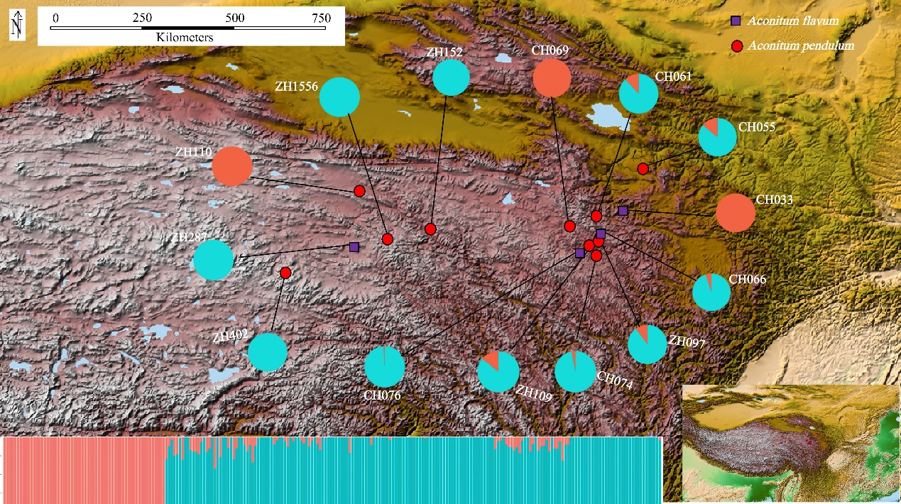 研究結(jié)果以?Population genetics and ecological niche modelling shed light on species boundaries and evolutionary history of Aconitum pendulum and A. flavum?為題發(fā)表在?Flora?上。西北高原所碩士研究生李強為該論文第一作者,張發(fā)起研究員為通訊作者。