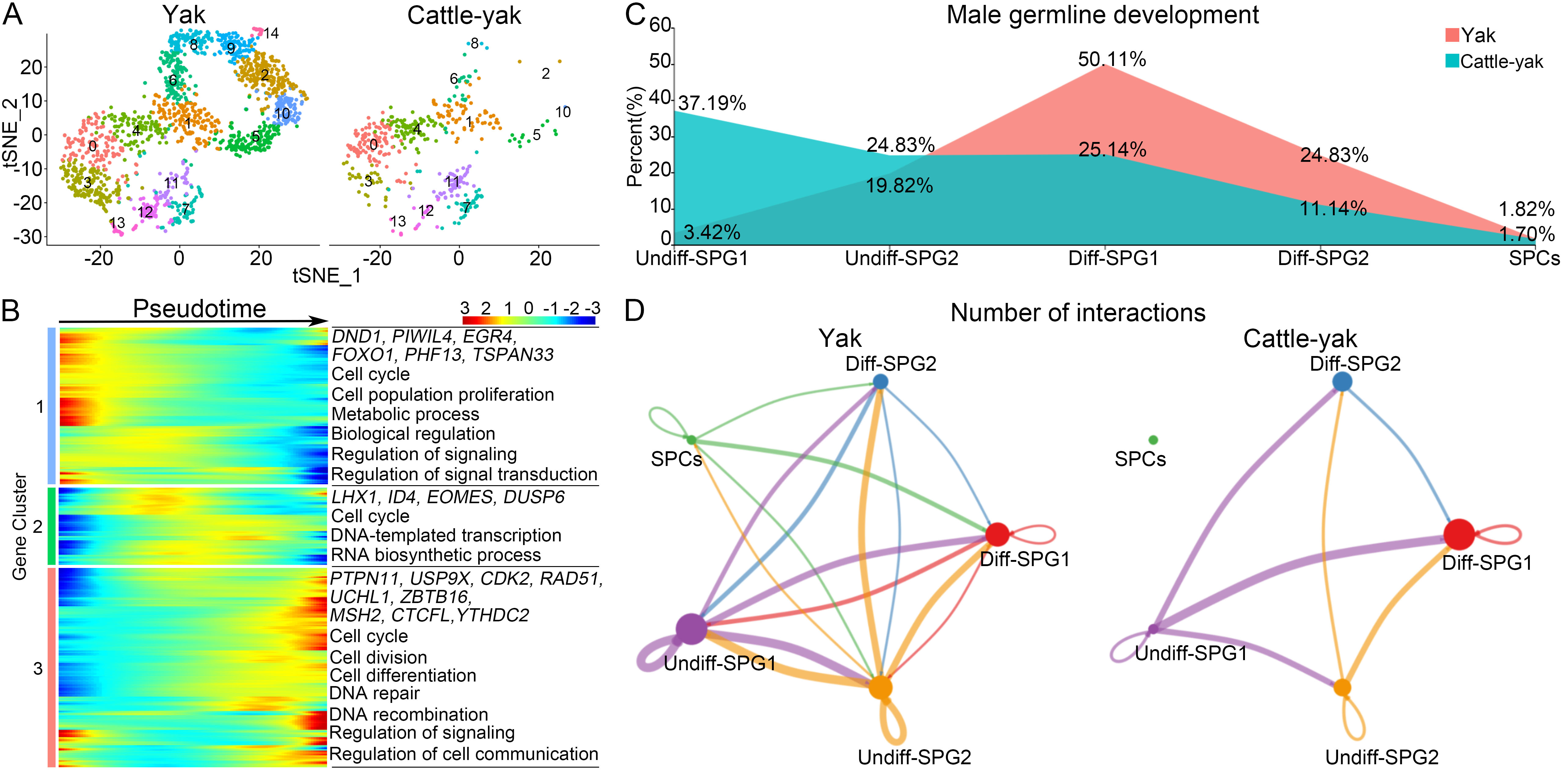 單細胞轉錄組分析揭示犏牛精原細胞命運決定異常。A:牦牛和犏牛生殖細胞單細胞tSNE聚類圖;B:隨擬時序變化的不同類型生殖細胞基因表達特征分析;C:兩種牛精原細胞和早期精母細胞比例;D:細胞通訊分析顯示兩種牛不同類型精原細胞互作存在顯著差異。未分化型精原細胞1(Undiff-SPG1)、未分化型精原細胞2(Undiff-SPG2)、分化型精原細胞1(Diff-SPG1)、分化型精原細胞2(Diff-SPG2)和精母細胞(SPCs)