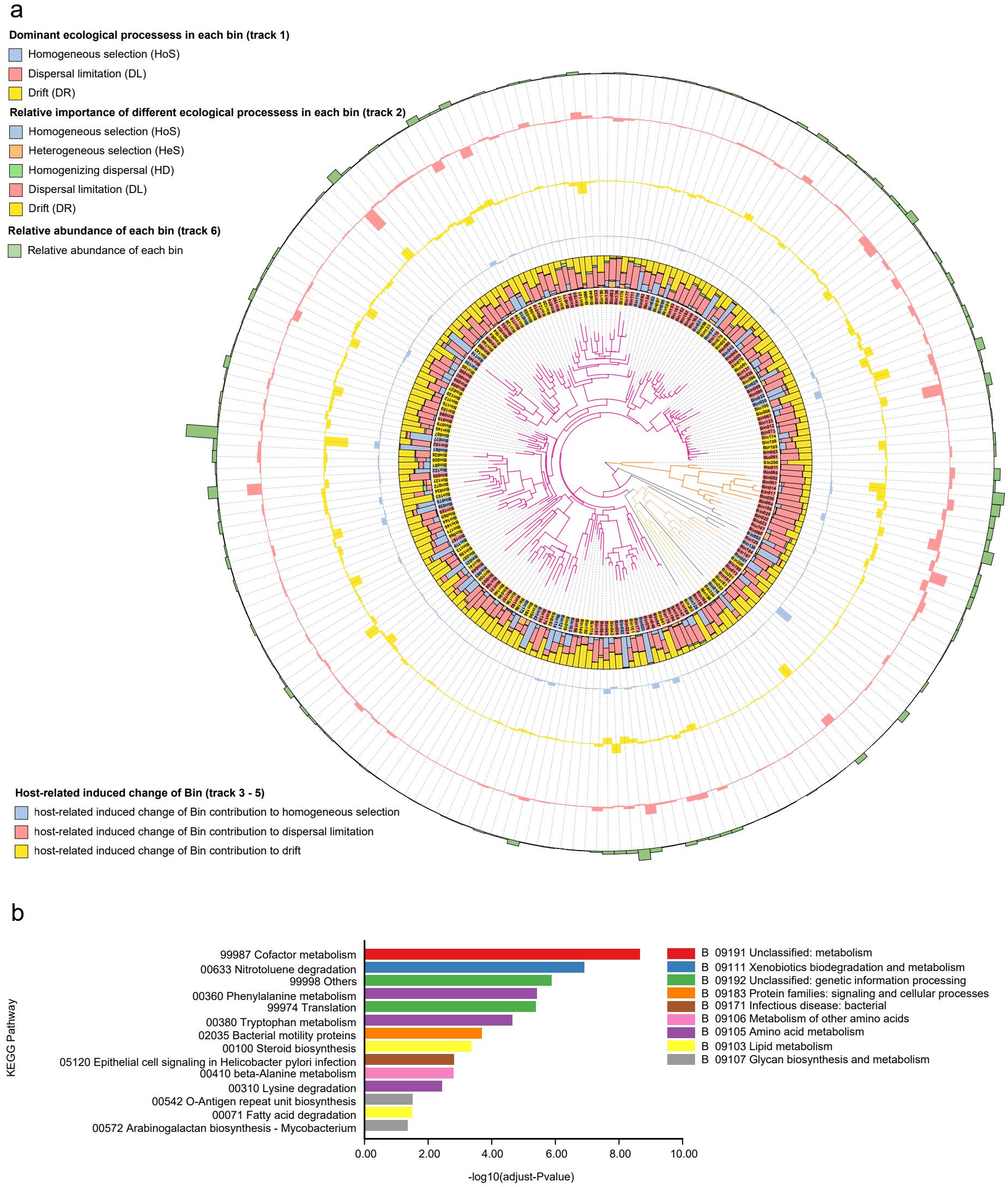 藏原羚和普氏原羚腸道微生物不同系統(tǒng)發(fā)育分箱的生態(tài)學組裝過程(a)及在普氏原羚腸道微生物中貢獻了同質(zhì)選擇過程而在藏原羚中卻貢獻了其他生態(tài)學組裝過程的ASVs集合所進行的KEGG富集分析(b)