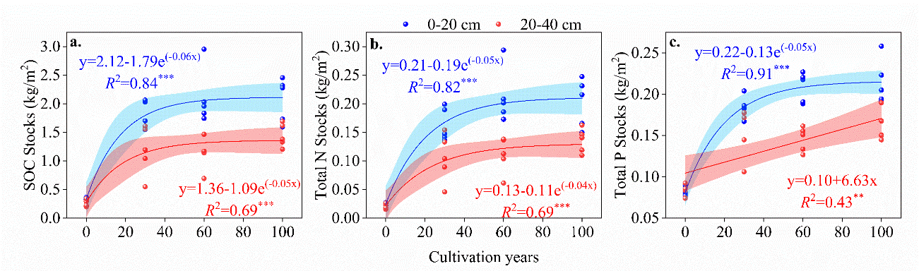 中國科學(xué)院西北生態(tài)環(huán)境資源研究院科研團(tuán)隊(duì)對張掖綠洲區(qū)不同開墾年限農(nóng)田土壤的碳儲(chǔ)量和養(yǎng)分儲(chǔ)量進(jìn)行了探究,通過回歸分析揭示了碳庫和養(yǎng)分庫隨常規(guī)耕作年限的變化模式,并結(jié)合隨機(jī)森林模型等分析了影響碳庫和養(yǎng)分庫的關(guān)鍵因子。研究發(fā)現(xiàn),沙漠開墾后0-40 cm土壤碳庫擴(kuò)大了4.2倍,氮儲(chǔ)量和磷儲(chǔ)量增加了1.2-6.5倍。然而,回歸分析表明碳儲(chǔ)量和養(yǎng)分儲(chǔ)量均隨耕作年限的增加呈指數(shù)變化模式,在常規(guī)耕作60年后,0-40 cm土層的碳庫和氮儲(chǔ)量及表層土壤中的磷儲(chǔ)量停止增長。土壤化學(xué)計(jì)量、pH和機(jī)械組成是影響綠洲農(nóng)田土壤碳庫和養(yǎng)分庫的關(guān)鍵因素。研究表明,雖然沙漠開墾后土壤質(zhì)量得到了顯著改善,但長期的常規(guī)管理措施限制了改良效應(yīng),因此,干旱區(qū)綠洲農(nóng)田的常規(guī)管理措施中應(yīng)適當(dāng)引入保護(hù)性耕作措施,以實(shí)現(xiàn)農(nóng)田土壤的可持續(xù)生產(chǎn)。