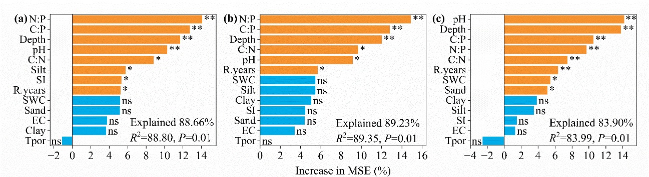 圖2?土壤理化指標(biāo)在解釋有機(jī)碳儲(chǔ)量(a)、總氮儲(chǔ)量(b)和總磷儲(chǔ)量(c)變化中的重要性