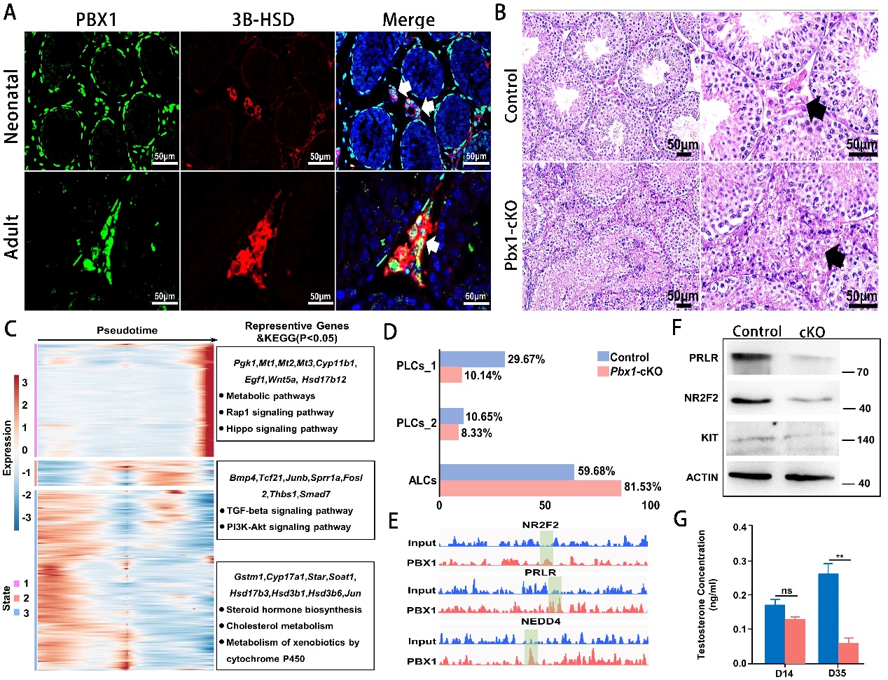 論文代表圖:A:轉(zhuǎn)錄因子PBX1在小鼠間質(zhì)細(xì)胞表達(dá);B:間質(zhì)細(xì)胞特異性敲除Pbx1導(dǎo)致曲精小管結(jié)構(gòu)完整性受損;C:Pbx1敲除導(dǎo)致間質(zhì)細(xì)胞基因表達(dá)異常;D: Pbx1敲除導(dǎo)致不同類型間質(zhì)細(xì)胞比例異常;E:ChIP-seq結(jié)果顯示PBX1和Nr2f、Prlp、Nedd4等類固醇合成關(guān)鍵基因的啟動子區(qū)結(jié)合;F:Nr2f、Prlp、Kit蛋白在Pbx1敲除間質(zhì)細(xì)胞的表達(dá)水平低于對照;G:Pbx1敲除小鼠睪酮水平顯著降低。