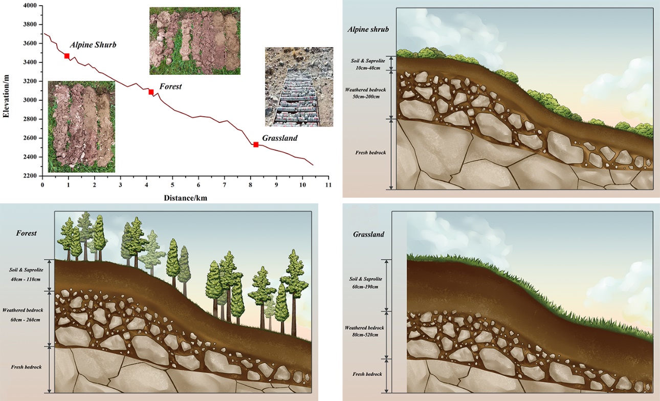 中國科學(xué)院西北生態(tài)環(huán)境資源研究院科研團隊對祁連山典型小流域土壤和基巖風(fēng)化層特征進(jìn)行了全面調(diào)查,分析了不同景觀單元下基巖風(fēng)化層結(jié)構(gòu)和儲水能力的變化,驗證了基巖風(fēng)化層儲水對徑流和植物用水的調(diào)節(jié)作用。
