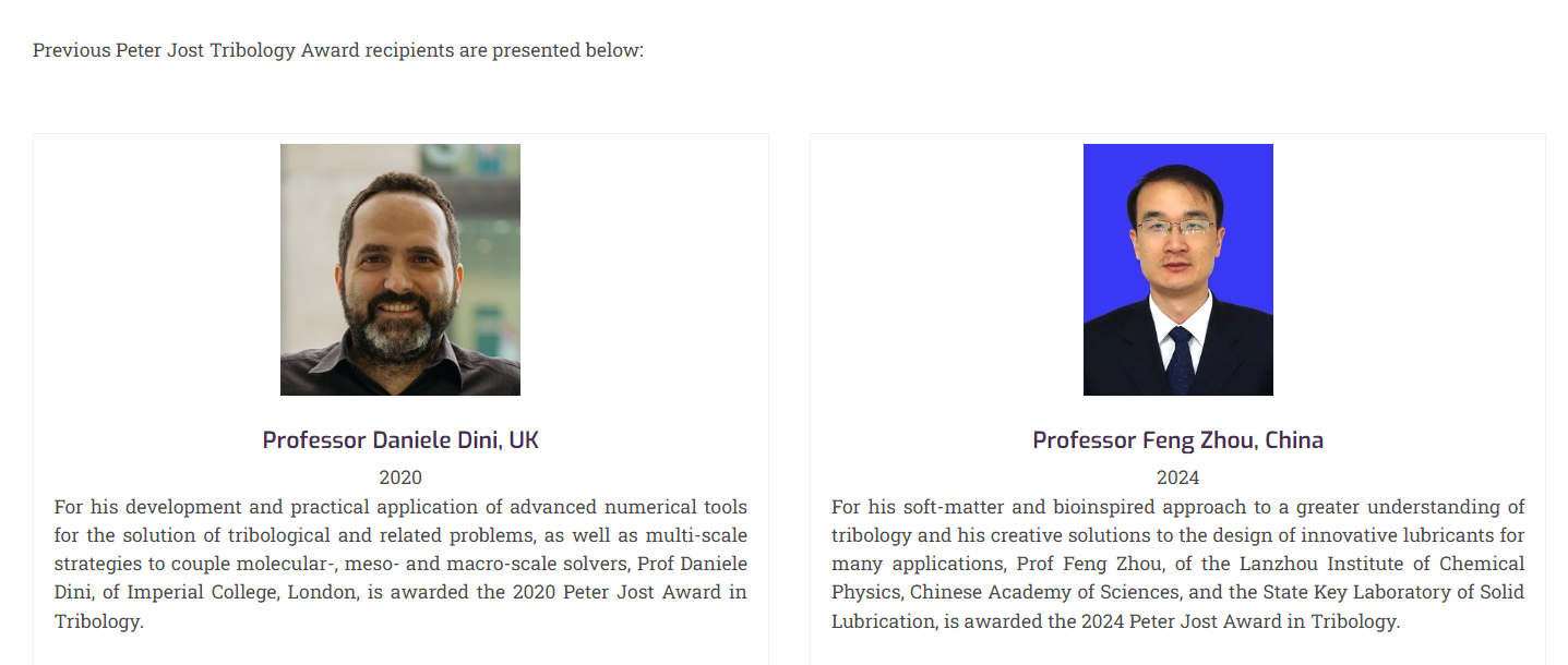 原文鏈接:https://itctribology.net/en/news/2024060713451747/prof-feng-zhou-awarded-peter-jost-tribology-award/
