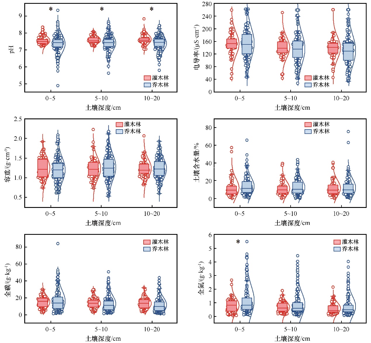 研究結(jié)果表明,農(nóng)牧交錯帶人工林土壤整體呈弱堿性,電導(dǎo)率153.55±3.02 μS·cm-1、土壤容重0.53~2.28 g·cm-3、土壤含水量12.54%±0.62%,土壤全碳和全氮含量分別為13.74±0.61 g·kg-1和0.88±0.05 g·kg-1。農(nóng)牧交錯帶人工林土壤自西向東酸性增強、容重下降、含水量增加、全碳含量下降、全氮含量增加。在氣候梯度上,人工林土壤pH值、電導(dǎo)率、容重與降水量顯著負相關(guān),而土壤含水量、全碳和全氮含量與年降水量顯著正相關(guān);人工林土壤全碳和全氮含量與年均氣溫和干燥度指數(shù)均顯著負相關(guān)。區(qū)域尺度上,喬木林土壤pH值顯著低于灌木林土壤,灌木林土壤全碳和全氮含量均高于喬木林(圖2)。