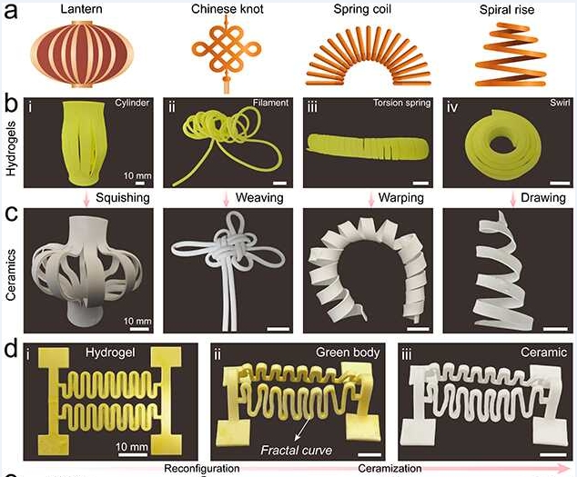 該團(tuán)隊(duì)受折紙/剪紙藝術(shù)啟發(fā),以水性無機(jī)粘結(jié)劑磷酸二氫鋁(AP)溶膠為水凝膠單體分散介質(zhì),將水凝膠單體和納米陶瓷粉體混合來制備光敏性水凝膠陶瓷漿料;利用光固化3D打印獲得具有優(yōu)異的延展性、形狀適應(yīng)性、抗疲勞性且可二次變形的水凝膠柔性骨架;依次經(jīng)過脫水干燥、低溫脫脂和高溫?zé)Y(jié)等步驟,實(shí)現(xiàn)了具有超低收縮、高陶瓷產(chǎn)率和形狀保真度的懸空大跨度陶瓷結(jié)構(gòu)(圖1)。設(shè)計(jì)的柔性水凝膠基陶瓷前驅(qū)體能夠?qū)崿F(xiàn)從平面形狀到3D立體結(jié)構(gòu)的轉(zhuǎn)變,突破了傳統(tǒng)硬質(zhì)/脆性陶瓷前驅(qū)體來制造復(fù)雜陶瓷結(jié)構(gòu)的局限。