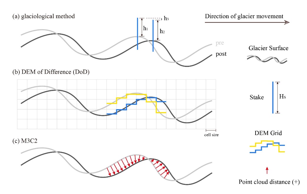 圖1 冰川測量方法對比:a) 花桿測量 b) DEM差分 3)M3C2
