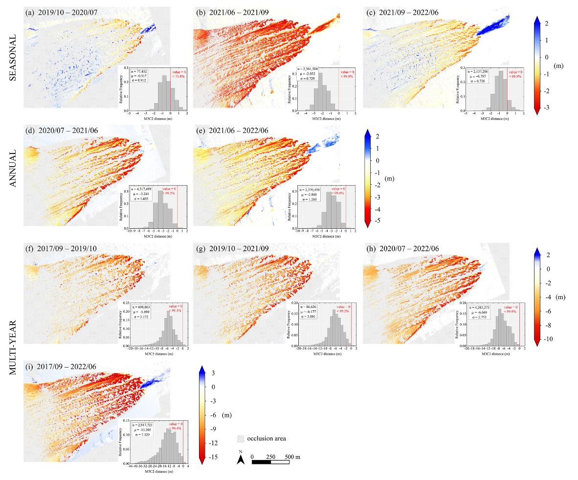 該研究通過運用Multiscale Model to Model Cloud Comparison(M3C2)算法,以厘米級精度對崗隴加瑪冰川下游的變化進行了全面刻畫。結(jié)合花桿觀測數(shù)據(jù)與降水記錄,研究團隊成功重建了該冰川的物質(zhì)平衡序列。