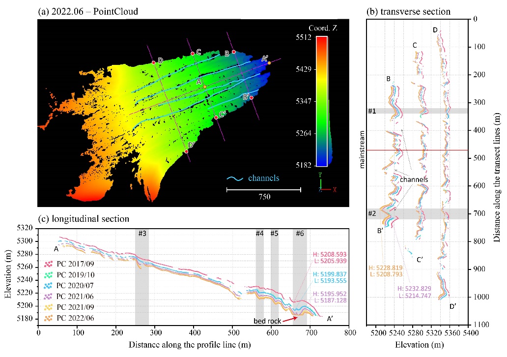 圖3 點云剖面視角下的冰面河道及冰面湖泊的分布與演化