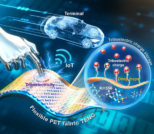 摩擦起電過程中產(chǎn)生的電荷會瞬時存儲在電介質(zhì)表面,進而被兩種不同類型的陷阱(淺陷阱和深陷阱)捕獲。其中,淺陷阱中的電荷容易逸出,優(yōu)先耗散到環(huán)境中,而深陷阱中的電荷則因為極難逸出,可長期儲存。因此,影響摩擦層電荷耗散率的關鍵因素是陷阱捕獲電荷和被捕獲電荷的逃逸能力。基于此,該團隊通過系統(tǒng)研究,揭示了載流子深陷阱在摩擦電荷存儲中的機制,通過分子自組裝技術在織物摩擦層界面構建載流子深陷阱的方式增加TENG的電輸出,將該織物TENG用于物聯(lián)網(wǎng)可穿戴電子設備的電源模塊,實現(xiàn)了對機械運動的穩(wěn)定控制。相關研究成果發(fā)表在Advanced Materials(2024,2303389)上。