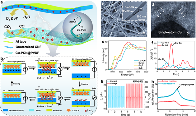 近日,研究團隊與新加坡科學技術研究局的科研人員合作,在界面電荷利用方面做出新突破,利用單原子銅錨定的聚合物碳氮化物催化劑和季銨化纖維素納米纖維成功實現(xiàn)了接觸電催化CO2還原,生成CO的法拉第效率達到96.24?。?/span>。季銨化纖維素納米纖維由于含豐富的羥基,可在高濕度環(huán)境中與水分子形成氫鍵,固定水分子并參與接觸帶電并發(fā)生氧化反應,導致氧氣和質(zhì)子的產(chǎn)生,參與觸電催化CO2還原過程。這種方法在低濃度CO2環(huán)境中能高效地將其轉化為CO,為減少大氣CO2排放和推進化學可持續(xù)性策略提供了一種解決方案。