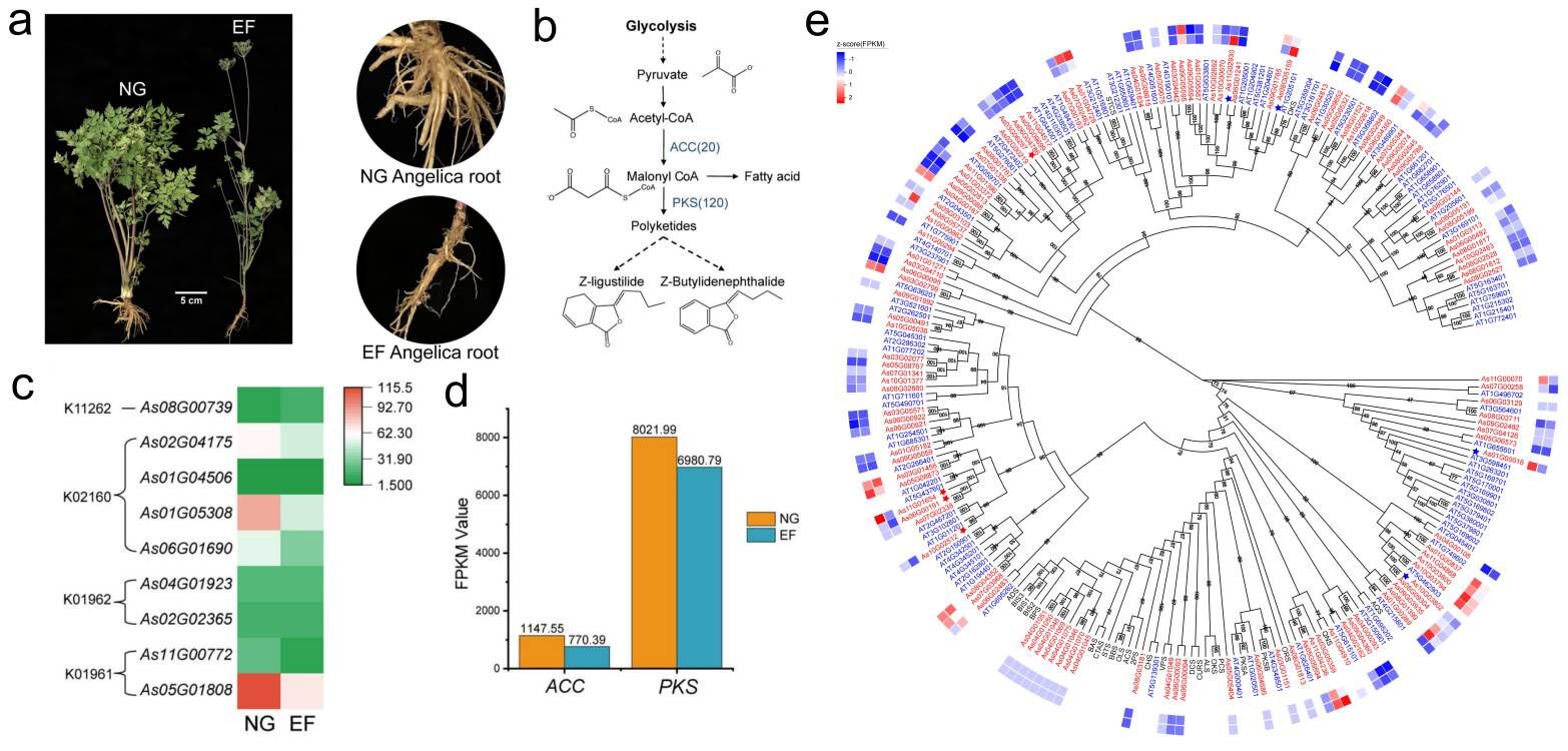 圖 苯酞類物質(zhì)的合成與調(diào)控 a.正常生長當(dāng)歸(NG)和早花當(dāng)歸(EF) b.丙二酰輔酶A的合成代謝途徑 c.正常當(dāng)歸和早花當(dāng)歸根中ACC基因的表達(dá)量熱圖 d. 正常當(dāng)歸和早花當(dāng)歸根中ACC基因和PKS基因的表達(dá)量值(FPKM)e.當(dāng)歸中PKS基因的進(jìn)化樹,及其在正常當(dāng)歸和早花當(dāng)歸中根的表達(dá)量熱圖。