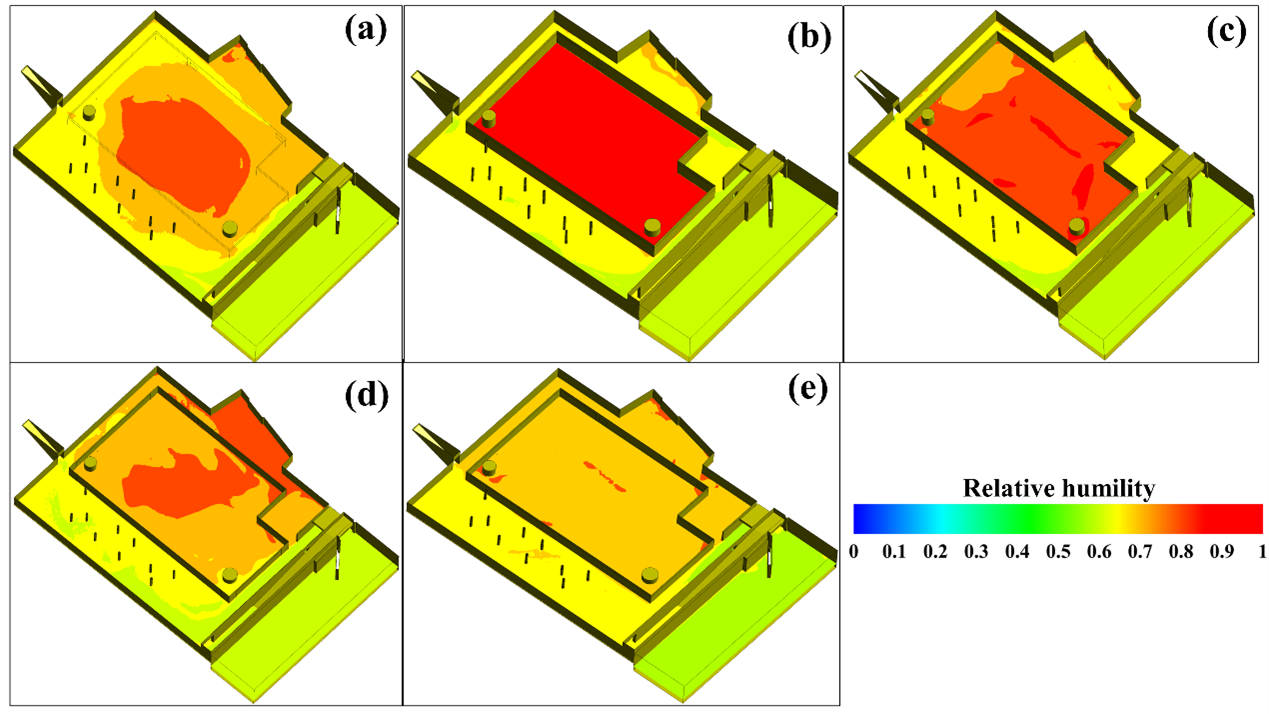 圖3? 5個不同改造階段遺址內部的相對濕度分布:(a)I階段;(b)II階段;(c)III階段;(d)IV階段;(e)V階段。