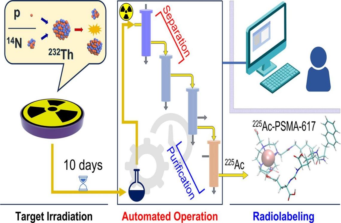 鐳-223(半衰期為11.4天)和錒-225(半衰期為10天)作為兩種極具潛力的阿爾法發(fā)射同位素,由于其獨特的物理化學性質(zhì),在小體積腫瘤和多位點轉(zhuǎn)移性癌癥的治療中展現(xiàn)出廣泛的應(yīng)用前景。然而,傳統(tǒng)的鐳-223和錒-225生產(chǎn)方法復雜且效率不高,難以滿足日益增長的需求,迫切需要開發(fā)出一種高效且自動化的制備系統(tǒng)。