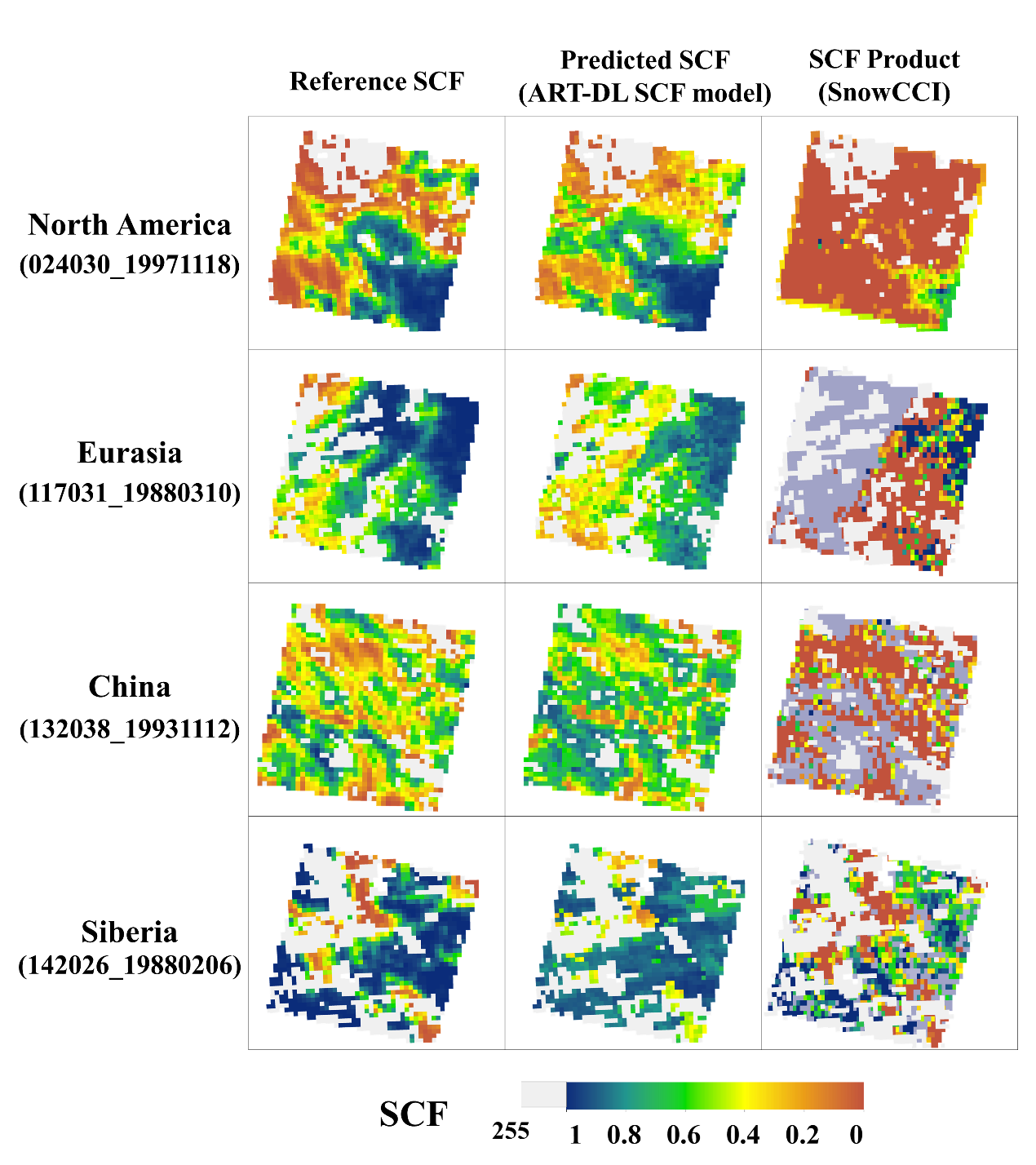 通過結合積雪輻射傳輸模型(ART),AVHRR表面反射率數(shù)據(jù)反演北半球SCF。新模型使用 Landsat 5積雪圖像作為參考SCF,將ART模型反演的積雪反照率作為物理約束納入相關的積雪識別參數(shù)中。