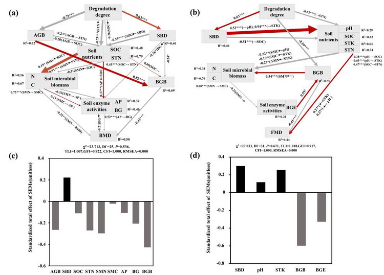 三江源高寒草甸土壤細菌多樣性(a, c)和真菌多樣性(b, d)的結構方程模型