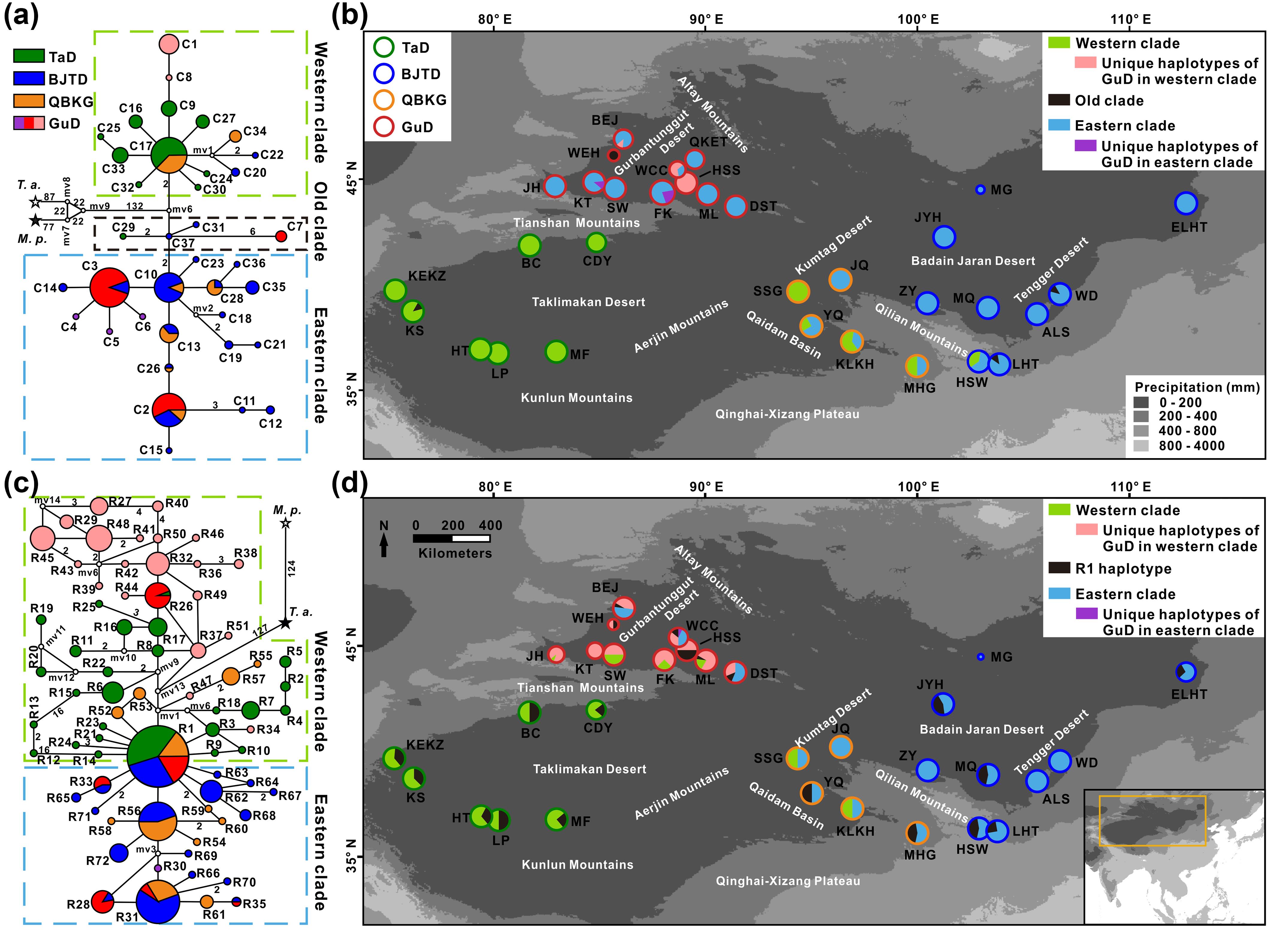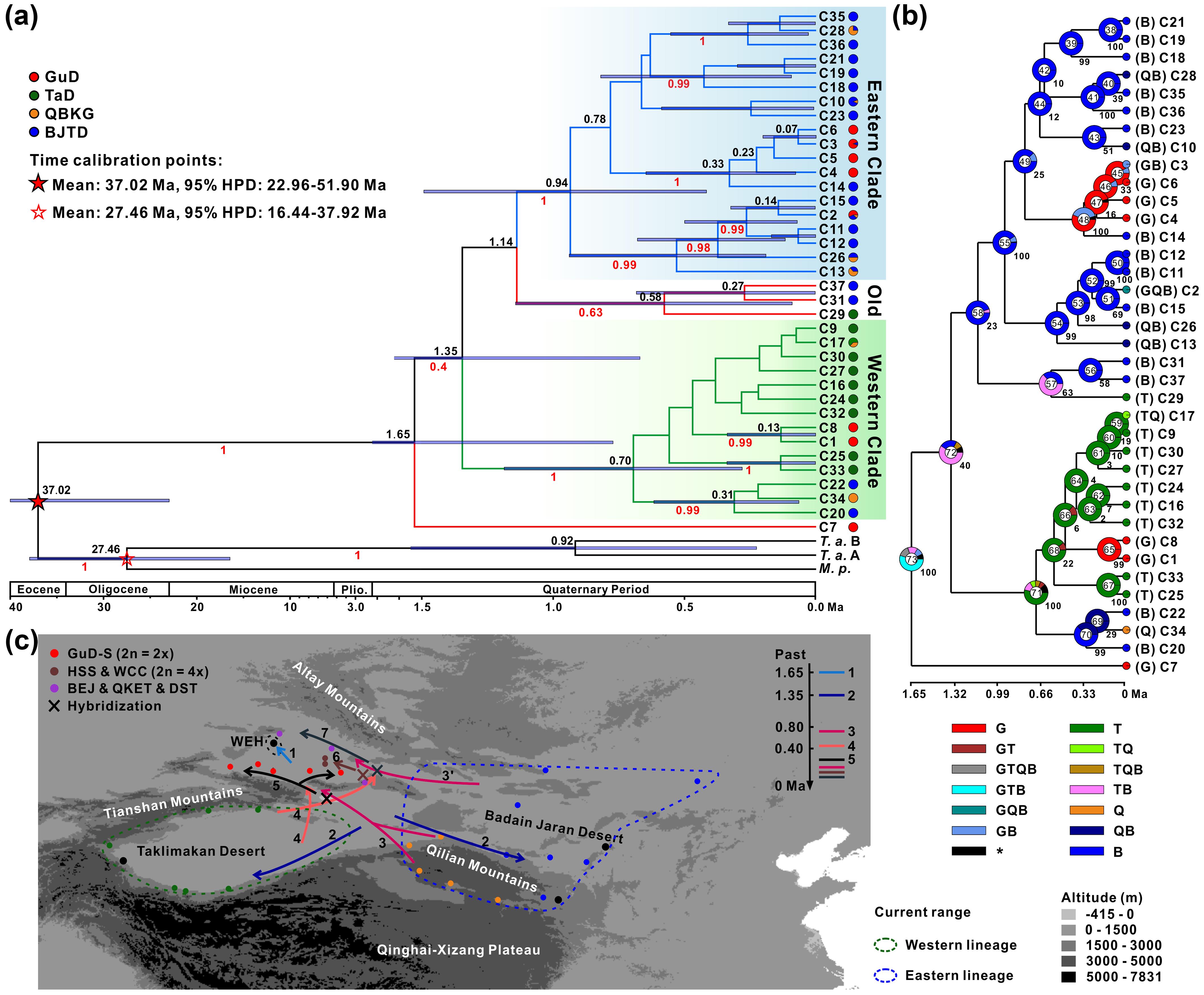 為了進(jìn)一步闡明紅砂不同支系的形成歷史,厘清雜交物種形成在北疆紅砂生物多樣性形成中的作用,中國(guó)科學(xué)院西北生態(tài)環(huán)境資源研究院馬小飛課題組采集了紅砂物種范圍的32個(gè)群體,通過(guò)分析并比對(duì)母系遺傳的cpDNA序列和雙親遺傳的nrITS序列在群體間的遺傳變異模式,重新深入解析了紅砂的譜系地理結(jié)構(gòu)及其時(shí)空演化歷史。