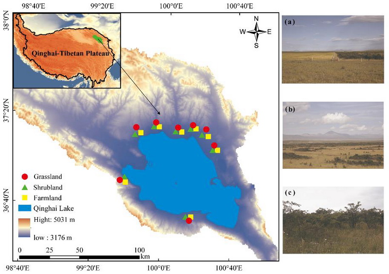 中國科學(xué)院西北高原生物研究所高原藥用資源生態(tài)保護(hù)與繁育學(xué)科團(tuán)隊(duì)在環(huán)青海湖區(qū)域分別選擇高寒草原、農(nóng)田、人工灌叢為研究對象,構(gòu)建了從天然草原—農(nóng)田—人工灌叢的土地利用類型轉(zhuǎn)化序列,測定了初級生產(chǎn)力、土壤真菌和細(xì)菌以及土壤因子。研究表明:隨著農(nóng)田向人工灌叢的轉(zhuǎn)化土壤環(huán)境因子和微生物群落組成呈現(xiàn)出逐漸向天然草地恢復(fù)的趨勢,土壤磷含量對土壤微生物群落組成的恢復(fù)發(fā)揮關(guān)鍵調(diào)節(jié)作用。退耕還林后土壤微生物共生網(wǎng)絡(luò)復(fù)雜性的恢復(fù)比微生物群落組成和功能類群的恢復(fù)需要更長的時(shí)間。最重要的是,本研究揭示了土壤微生物共生網(wǎng)絡(luò)復(fù)雜性在土地利用變化過程中介導(dǎo)初級生產(chǎn)力對土壤多功能性的影響。這些發(fā)現(xiàn)彌補(bǔ)了我們對咸水湖生境周圍土地利用變化過程認(rèn)識的不足,對于拓寬我們對土地利用變化的認(rèn)識,促進(jìn)全球高寒生態(tài)系統(tǒng)恢復(fù)決策的制定具有重要意義。