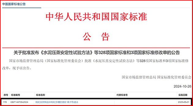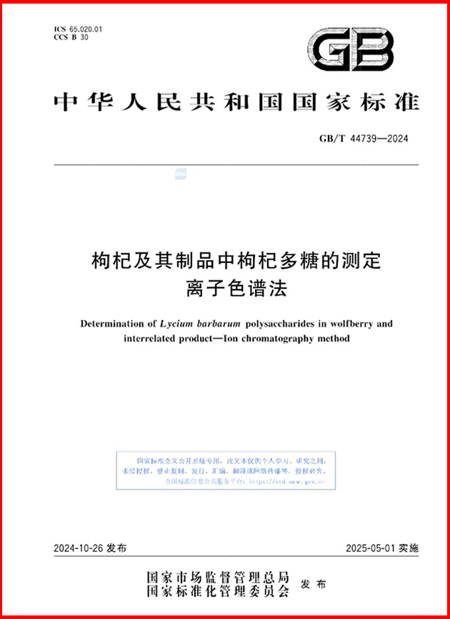 該團(tuán)隊(duì)自2019年起,以枸杞多糖為研究對象,開展了枸杞多糖含量分析新方法的研究和國家標(biāo)準(zhǔn)的制訂。10月26日,由蘭州化物所牽頭、寧夏回族自治區(qū)藥品檢驗(yàn)研究院等單位參與制訂的國家標(biāo)準(zhǔn)《枸杞及其制品中枸杞多糖的測定 離子色譜法》(GB/T 44739-2024),由國家市場監(jiān)督管理總局(國家標(biāo)準(zhǔn)化管理委員會(huì))批準(zhǔn)發(fā)布,將于2025年5月1日正式實(shí)施。