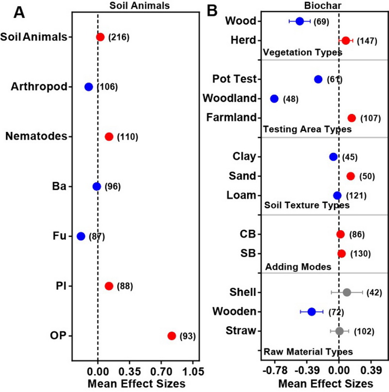 近年來,全球范圍內(nèi)對生物炭作為土壤調(diào)節(jié)劑的應(yīng)用興趣顯著增加。土壤動物在土壤生態(tài)系統(tǒng)中種類繁多,并對土壤環(huán)境的變化表現(xiàn)出高度敏感性。它們在評估不同田間管理條件和土地利用狀況下的土壤健康方面發(fā)揮著至關(guān)重要的作用。生物炭對土壤動物的影響既包括土壤動物的直接取食作用,也涉及生物炭對土壤環(huán)境的間接影響。然而,目前尚缺乏關(guān)于生物炭添加對土壤動物影響的系統(tǒng)性和定量性研究。薈萃分析能夠促進對已有研究結(jié)果的定量整合,通過整合多個發(fā)現(xiàn),尤其是在特定主題下樣本量相對較小的情況下,可以提高統(tǒng)計效率,解決研究結(jié)果間的不一致性,探討現(xiàn)有文獻(xiàn)中的發(fā)表偏差,制定新的研究問題,并為進一步分析研究提供理論性框架和標(biāo)準(zhǔn)化體系。