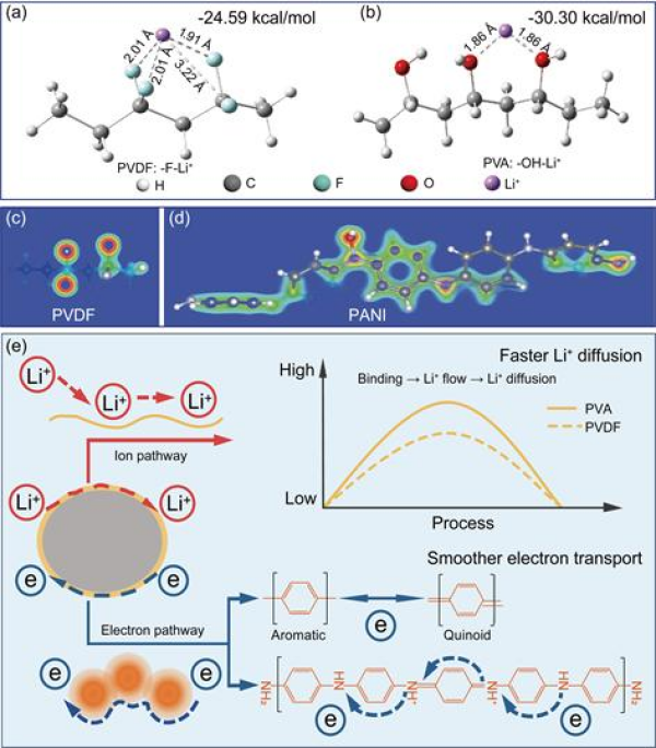 針對電化學(xué)吸附過程中電極內(nèi)Li+擴(kuò)散速率和電子轉(zhuǎn)移速率不匹配,從而制約電極電化學(xué)活性的問題,設(shè)計(jì)和制備了離子和電子雙導(dǎo)聚(乙烯醇)-聚苯胺(PVA-PANI)共聚物(CP),并包覆到吸附劑顆粒表面,促進(jìn)Li+擴(kuò)散和電子轉(zhuǎn)移,實(shí)現(xiàn)吸附效率的提高。HMO@CP電極具有優(yōu)越的電化學(xué)活性和吸附效率,吸附容量高達(dá)49.48 mg/g。機(jī)理研究表明,PVA中帶負(fù)電荷的羥基(-OH)可以富集Li+并加速Li+的擴(kuò)散,PANI中的共軛結(jié)構(gòu)和氧化還原活性醌類位點(diǎn)提供了更密集的電子分布促進(jìn)電子轉(zhuǎn)移(圖1)。該工作以離子擴(kuò)散和電子轉(zhuǎn)移為出發(fā)點(diǎn),以提高離子擴(kuò)散速率和電子轉(zhuǎn)移速率匹配度為導(dǎo)向,實(shí)現(xiàn)吸附效率的提高(ACS Nano,18 (2024) 31204-31214)。
