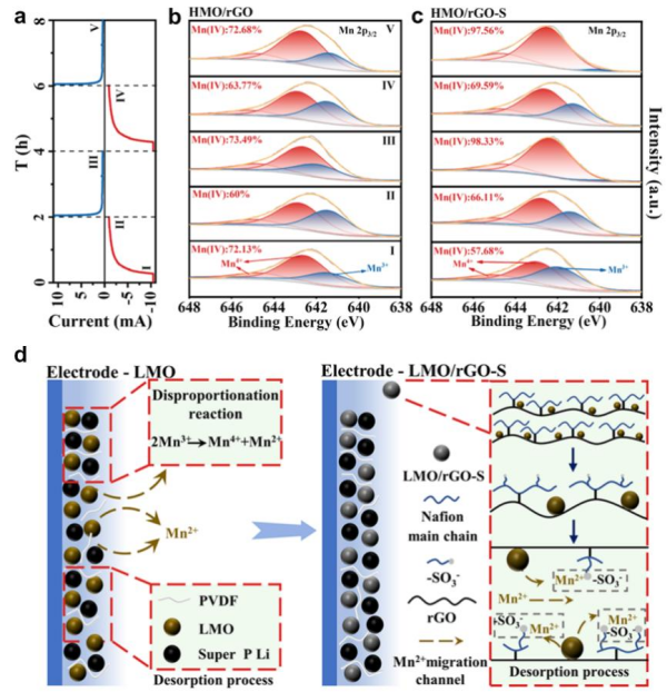 除離子傳輸效率外,針對錳基電活性材料因電極極化導(dǎo)致的穩(wěn)定性較差的問題,采用還原氧化石墨烯(rGO)與Nafion協(xié)同改性的策略制備得到高效穩(wěn)定電化學(xué)吸附材料。rGO在增加材料分散性的同時大幅降低了材料極化,緩解極化過程帶來的容量衰減,使得吸附容量和循環(huán)穩(wěn)定性得到提升。研究表明Nafion通過主鏈與還原氧化石墨烯表面羧基結(jié)合,而支鏈磺酸基團(tuán)(-SO3-)可以捕獲因歧化反應(yīng)溶出的Mn2+,從而使得材料表面局部Mn2+濃度升高(圖2)。經(jīng)過協(xié)同改性,材料30次循環(huán)容量保持率由79.04%提升至94.64%。該研究驗(yàn)證了離子捕獲機(jī)制抑制歧化反應(yīng)的可行性,能夠?yàn)殄i系材料在電化學(xué)分離過程中的溶損問題提供新的解決思路(Chem. Eng. J,497?。?024) 155009)。