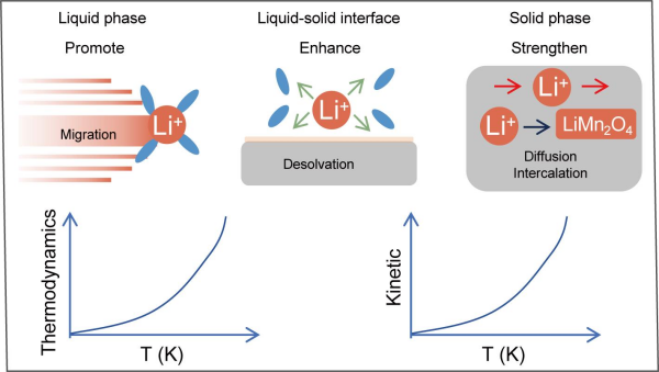 在材料改性的基礎(chǔ)上,青海鹽湖研究所科研人員針對環(huán)境溫度影響電化學(xué)吸附熱力學(xué)和動力學(xué)研究不夠深入的問題,開展了逐步升溫的策略(273.15到328.15 K),探究了溫度如何影響液相中水合離子遷移,固液界面離子脫水合和電子轉(zhuǎn)移,固相中離子擴(kuò)散等行為的熱力學(xué)和動力學(xué)(圖3)。該研究通過升溫強(qiáng)化了熱力學(xué)和動力學(xué),使吸附速率和吸附容量改善,且通過調(diào)節(jié)反應(yīng)參數(shù)優(yōu)化反應(yīng)速率的策略也可用于電池、催化合能源等領(lǐng)域(Sep. Purif. Technol.355?。?025) 129631)。