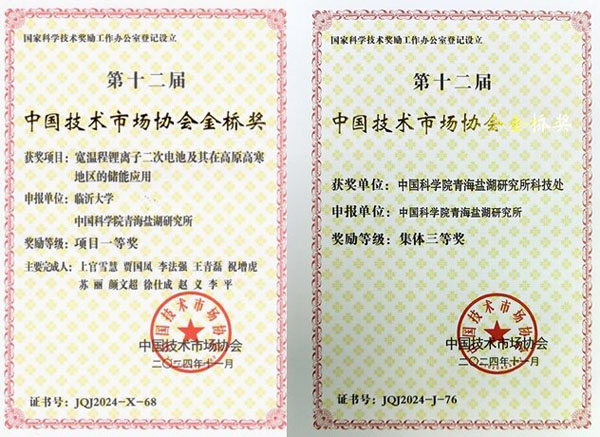 12月14日,由中國技術(shù)市場協(xié)會主辦的第十二屆中國技術(shù)市場協(xié)會金橋獎表彰獎勵大會在北京舉行,中國科學(xué)院青海鹽湖研究所獲項(xiàng)目獎1項(xiàng)、集體獎1項(xiàng)。“寬溫程鋰離子二次電池及其在高原高寒地區(qū)的儲能應(yīng)用”項(xiàng)目獲“項(xiàng)目一等獎”,科技處獲“集體三等獎”。