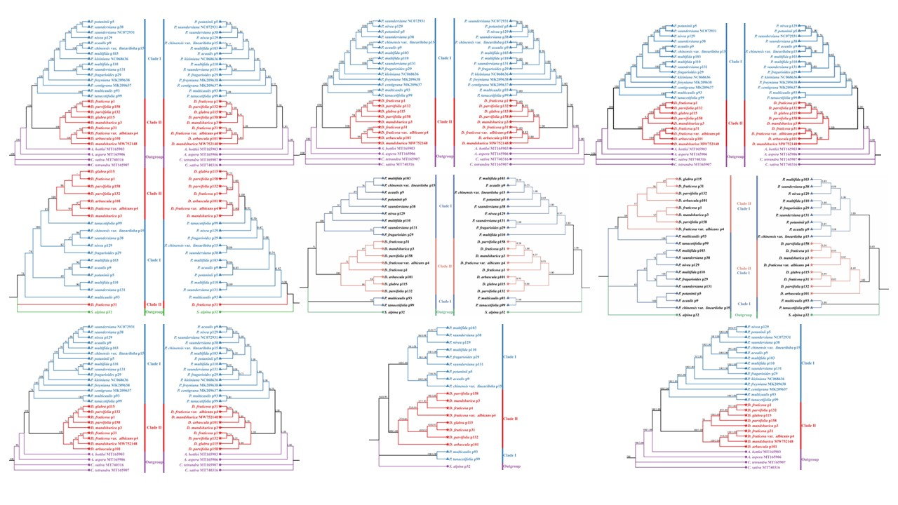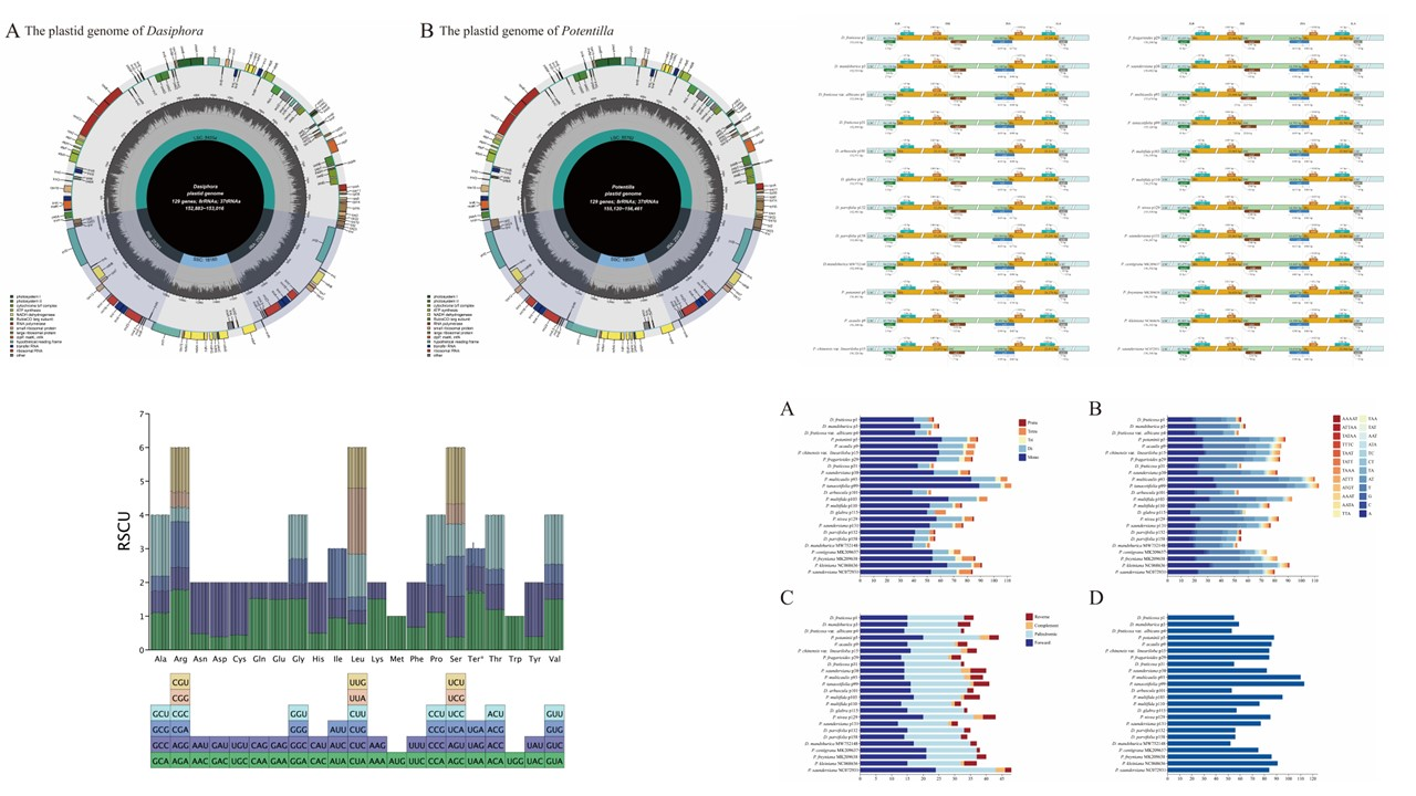 中國(guó)科學(xué)院西北高原生物研究所青藏高原植物適應(yīng)與進(jìn)化研究團(tuán)隊(duì)選擇了19個(gè)委陵菜屬和金露梅屬的全質(zhì)體基因組進(jìn)行Illumina二代測(cè)序,重建了該類群的系統(tǒng)發(fā)育關(guān)系,并研究了他們之間的核質(zhì)沖突關(guān)系。研究結(jié)果表明,這些質(zhì)體基因組的結(jié)構(gòu)、GC含量和基因組成都高度保守,包含84個(gè)CDS、37個(gè)tRNA基因和8個(gè)rRNA基因。此外,所有金露梅屬質(zhì)體基因組的rpl2失去了唯一的內(nèi)含子。比較基因組分析結(jié)果表明,質(zhì)體大小的差異歸因于LSC區(qū)、SSC區(qū)和IRS區(qū)的長(zhǎng)度差異,并且IR區(qū)大部分是保守的,非編碼區(qū)比編碼區(qū)具有更高的差異性。我們篩選了SSR,發(fā)現(xiàn)了7個(gè)高度可變位點(diǎn),可作為潛在的分子標(biāo)記,在闡明委陵菜屬和金露梅屬的屬間關(guān)系上具有一定的參考意義。通過核基因(ITS、ETS)和細(xì)胞質(zhì)基因(質(zhì)體、線粒體)構(gòu)建的系統(tǒng)發(fā)育樹,確定了委陵菜屬和金露梅屬的單系性。我們?cè)谖瓴藢僦袡z測(cè)到了核質(zhì)沖突,這種沖突往往會(huì)導(dǎo)致其單系性發(fā)生變化,我們推測(cè)可能在其進(jìn)化過程中發(fā)生了一定程度的種間雜交或不完整譜系分選事件。本研究通過對(duì)委陵菜屬和金露梅屬的系統(tǒng)發(fā)育比較分析,為該類群之間的分類學(xué)研究奠定基礎(chǔ)。