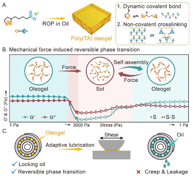 針對傳統(tǒng)潤滑油脂在新型高端裝備應用中面臨爬移、泄漏、粘滯阻力高等難以應對復雜多變工況的問題。近日,中國科學院蘭州化學物理研究所潤滑材料全國重點實驗室材料表面與界面研究組通過構(gòu)筑具有機械力響應特性的動態(tài)共價網(wǎng)絡,開發(fā)了一類具有力誘導可逆相轉(zhuǎn)變能力的自適應油凝膠潤滑材料(PTA油凝膠)。PTA油凝膠可適應設備啟停,在溶膠或凝膠狀態(tài)保持和迅速轉(zhuǎn)換,且具有出色的潤滑穩(wěn)定性、適應不斷變化的運動工況。