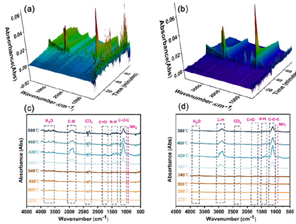 新型防凍固沙劑氣化熱解產(chǎn)物的三維TG-IR光譜(a)(b)和FTIR光譜(c)(d)