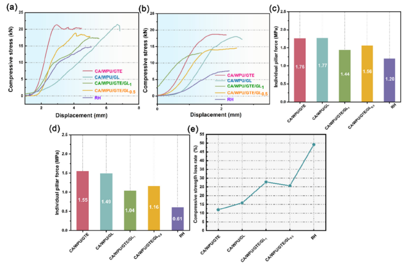 新型防凍固沙劑固結(jié)層在 27℃時(shí)的壓應(yīng)力(a)和抗壓強(qiáng)度(c);-20℃凍融循環(huán)試驗(yàn)后的壓應(yīng)力(b)、抗壓強(qiáng)度(d)、抗壓強(qiáng)度損失率(e)