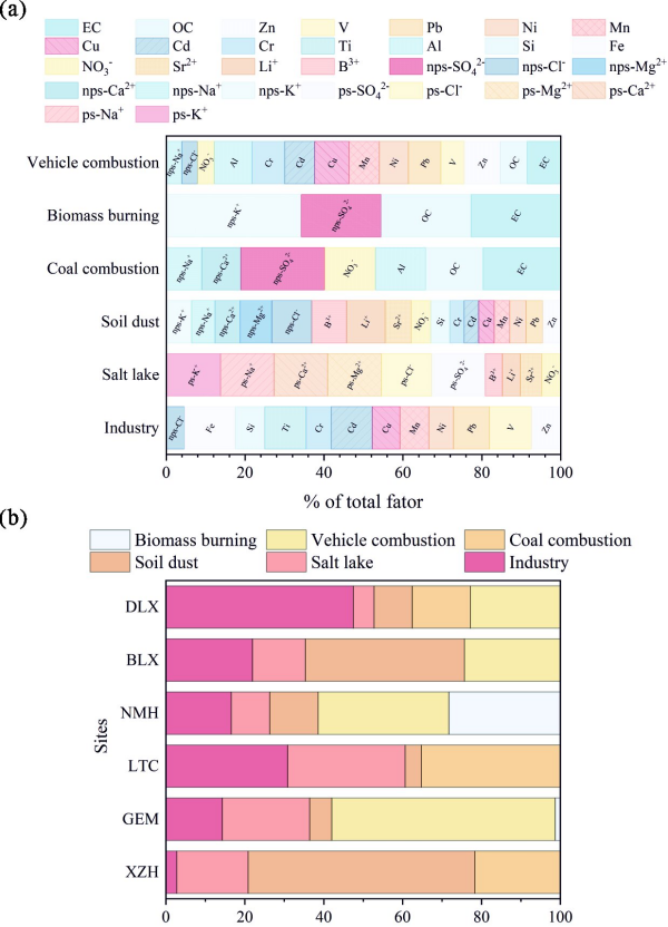 研究表明,柴達(dá)木盆地大氣降塵中石鹽和石膏的含量范圍為 0 至 47 wt%,鹽塵沉積通量(SDF)在 0 至 2.54 g/m2·30d 之間變化,其主要可溶性離子包括nps-SO42?、ps-Cl??和ps-Na+。不同采樣點(diǎn)的ps和nps組分的分布趨勢與可溶性離子相似,ps-Na+和ps-Cl–占比分別為49.52±34.59%和58.14±40.02%,表明鹽湖排放顯著影響降塵成分。源解析結(jié)果顯示,鹽湖排放貢獻(xiàn)了降塵來源的 5.23% ~ 29.76%,顯示了鹽湖來源的粉塵對大氣降塵具有不可忽視的重要貢獻(xiàn)。