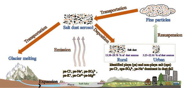 研究表明,鹽塵可能是內(nèi)陸地區(qū)Na?和Cl?離子的重要來源,尤其是在春季和冬季,西北風(fēng)將大量鹽塵輸送到下游地區(qū),甚至影響到東亞和更廣泛區(qū)域的空氣質(zhì)量。此外,鹽塵的排放可能形成一個(gè)區(qū)域正反饋循環(huán):鹽塵加劇了冰川的消融,冰川融化則增加了河流徑流量,進(jìn)而擴(kuò)大了鹽湖及周邊鹽漬土的范圍,從而導(dǎo)致更多的鹽塵釋放到大氣中并進(jìn)一步加速冰川融化。這一認(rèn)識對全球生態(tài)安全和水資源管理具有重要啟示意義。這項(xiàng)研究系統(tǒng)評估了鹽塵排放對大氣顆粒物沉積的貢獻(xiàn),揭示了鹽塵在區(qū)域及全球氣候環(huán)境變化中的潛在作用。根據(jù)本研究結(jié)果,建議在全球變暖背景下,未來制訂環(huán)境政策和構(gòu)建氣候模型時(shí)需要更多地關(guān)注內(nèi)陸鹽湖粉塵的影響。