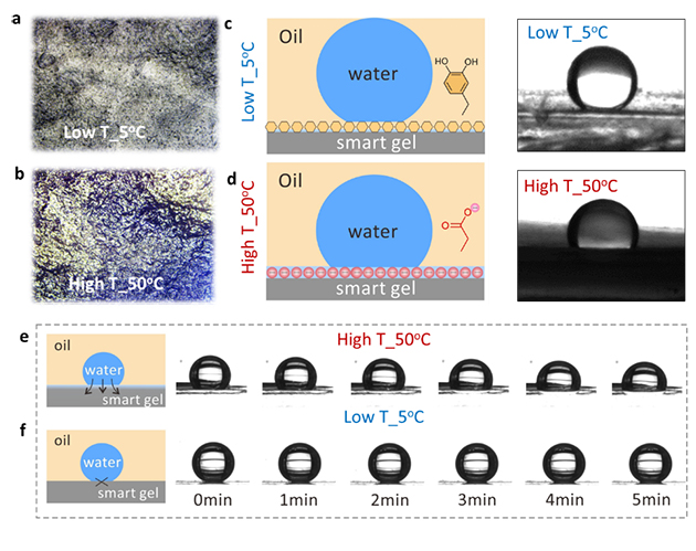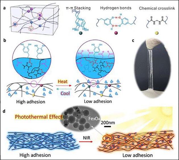 研究人員進(jìn)一步揭示了其作用機(jī)制,通過(guò)近紅外光激發(fā)納米顆粒產(chǎn)生熱效應(yīng),誘導(dǎo)水凝膠發(fā)生溫度響應(yīng)性相變,實(shí)現(xiàn)軟物質(zhì)表面水分子的滲出/吸收,改變其表面親水羧酸基團(tuán)的分子構(gòu)象,進(jìn)而可逆地控制鄰苯二酚基團(tuán)的屏蔽和暴露。這種基于界面分子構(gòu)象變化調(diào)控的黏附機(jī)制具有無(wú)殘留、可重復(fù)使用的特點(diǎn),為智能黏附材料的開(kāi)發(fā)提供了新思路。