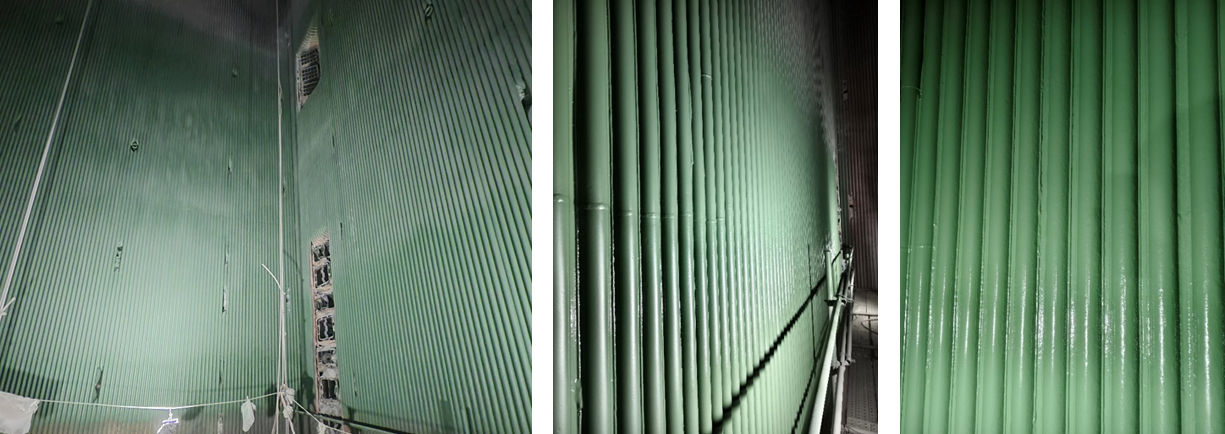 隨后,團隊在165MW機組開展了納米高熵陶瓷涂層的全爐膛輻射受熱面應(yīng)用。西安熱工研究院能效測試結(jié)果表明,材料在爐膛服役5個月后,爐內(nèi)無明顯結(jié)焦和高溫腐蝕現(xiàn)象。通過對比噴涂前、后實測數(shù)據(jù),在高、中、低負荷下,爐內(nèi)有效吸熱量平均提升5.19%,減溫水量整體降低2.6t/h,排煙溫度降低4.5℃,灰渣物理熱損失降低0.21%,鍋爐熱效率提升0.46%,供電煤耗降低1.5g/kWh。對于1000MW煤電機組每年節(jié)煤13140噸。此外,噴涂納米高熵陶瓷涂層還有效緩解了高溫氧化與磨損風(fēng)險,增強了機組的煤種適應(yīng)性。