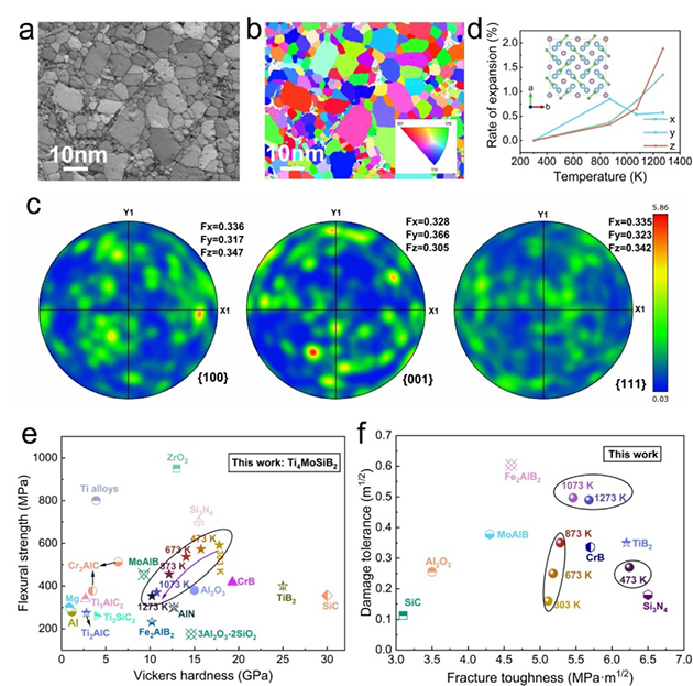 近日,中國科學(xué)院蘭州化學(xué)物理研究所蘭州潤滑材料與技術(shù)創(chuàng)新中心基于T2相通過M位合金化構(gòu)筑策略成功合成了具有面外化學(xué)有序的四元層狀過渡金屬硼化物MAB相—Ti4MoSiB2陶瓷(圖1),并系統(tǒng)研究了其在寬溫域內(nèi)的力學(xué)性能和摩擦學(xué)行為,研究人員發(fā)現(xiàn)材料原子尺度上的層狀結(jié)構(gòu)在穿晶斷裂時(shí)有效引導(dǎo)裂紋偏轉(zhuǎn),改變裂紋擴(kuò)展路徑,提高低溫?cái)嗔秧g性;由于晶粒沿不同方向熱膨脹差異造成晶界的熱失配,進(jìn)而改變了斷裂模式,使材料在室溫至1000℃范圍內(nèi)表現(xiàn)出優(yōu)異的綜合力學(xué)性能,同時(shí)賦予了較傳統(tǒng)陶瓷優(yōu)異的損傷容限。與DD5高溫合金對摩時(shí)在全溫度范圍內(nèi)都具有良好的抗磨性能,尤其在高溫條件下摩擦化學(xué)反應(yīng)生成的具有氧空位TiO2,一定程度上實(shí)現(xiàn)減摩效果,并實(shí)現(xiàn)了“負(fù)磨損”現(xiàn)象。這些發(fā)現(xiàn)不僅豐富了MAB相材料的基礎(chǔ)理論,也為開發(fā)新型高溫結(jié)構(gòu)功能一體化材料提供了重要指導(dǎo)。