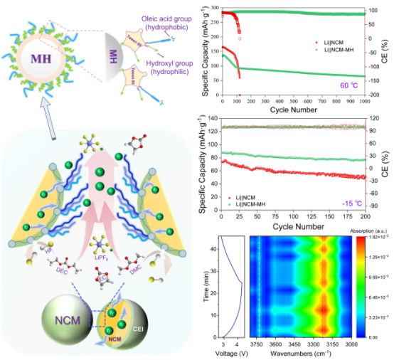 研究團(tuán)隊(duì)首先以Tween80為框架物質(zhì)構(gòu)建一種弱交聯(lián)柔性受限空間,電沉積獲得所需超細(xì)納米氫氧化鎂載體(D50=15 nm),并通過(guò)Tween80原位改性實(shí)現(xiàn)納米氫氧化鎂功能化。用所得材料對(duì)鋰電池三元正極材料(LiNi0.5Co0.2Mn0.3O2)進(jìn)行表面修飾,并進(jìn)行電池組裝和性能測(cè)試。原位紅外分析表明,Li?與 Tween80 分子間存在持續(xù)的配位和解離過(guò)程,使Tween80 分子荷電狀態(tài)發(fā)生動(dòng)態(tài)變化,并在電場(chǎng)作用下發(fā)生連續(xù)的構(gòu)型轉(zhuǎn)變,亦即“烷基鏈搖曳”行為。烷基鏈搖曳使得納米氫氧化鎂在電池循環(huán)伊始就參與反應(yīng),快速形成薄而致密的富鎂無(wú)機(jī)正極固態(tài)電解質(zhì)界面膜。這種膜熱穩(wěn)定性高、耐腐蝕性強(qiáng),能夠有效抵御高溫電解液攻擊。而在低溫環(huán)境下,電解液通常會(huì)在正極表面積聚,并常因流動(dòng)性差而阻礙鋰離子傳輸。此時(shí)烷基鏈搖曳可顯著促進(jìn)電解液的界面流動(dòng),兼之富鎂界面層具有優(yōu)異離子導(dǎo)電性,使鋰離子低溫傳輸變得非常順暢。研究結(jié)果表明,通過(guò)“烷基鏈搖曳”界面驅(qū)動(dòng)設(shè)計(jì),鋰離子電池可在60℃穩(wěn)定充放電1000圈以上,同時(shí)保持70 mAh/g容量和90%以上庫(kù)侖效率。在-5℃和-15℃分別循環(huán)500圈、200圈后,容量仍能保持在80 mAh/g以上。該研究在配備熱管控系統(tǒng)后,電池實(shí)際寬溫域性能有望進(jìn)一步提升。