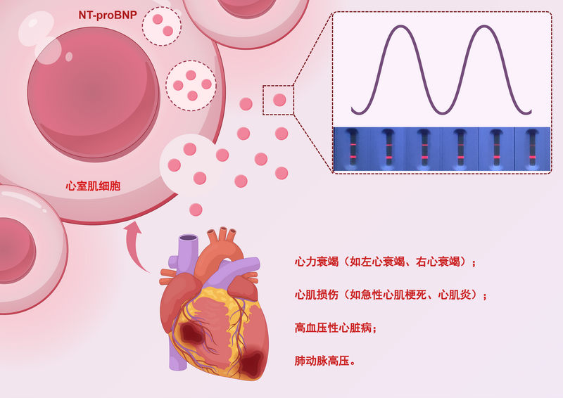 心臟在心力衰竭時(shí),心肌細(xì)胞釋放NT-proBNP后被試劑盒通過時(shí)間分辨熒光系統(tǒng)檢出的示意圖