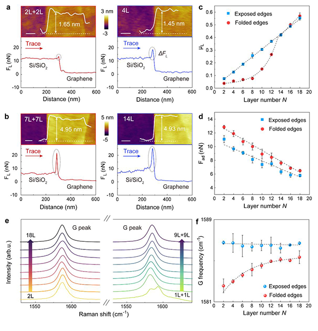團(tuán)隊(duì)基于原子力顯微鏡納米針尖操縱技術(shù),構(gòu)筑了具有可控曲率與層數(shù)的折疊石墨烯邊緣拓?fù)浣Y(jié)構(gòu)(圖1),系統(tǒng)開展了納米尺度摩擦測量。研究發(fā)現(xiàn),折疊石墨烯邊緣摩擦力隨層數(shù)呈現(xiàn)出顯著的非線性變化(圖2),違背了經(jīng)典摩擦定律在固-固界面下的適用性。