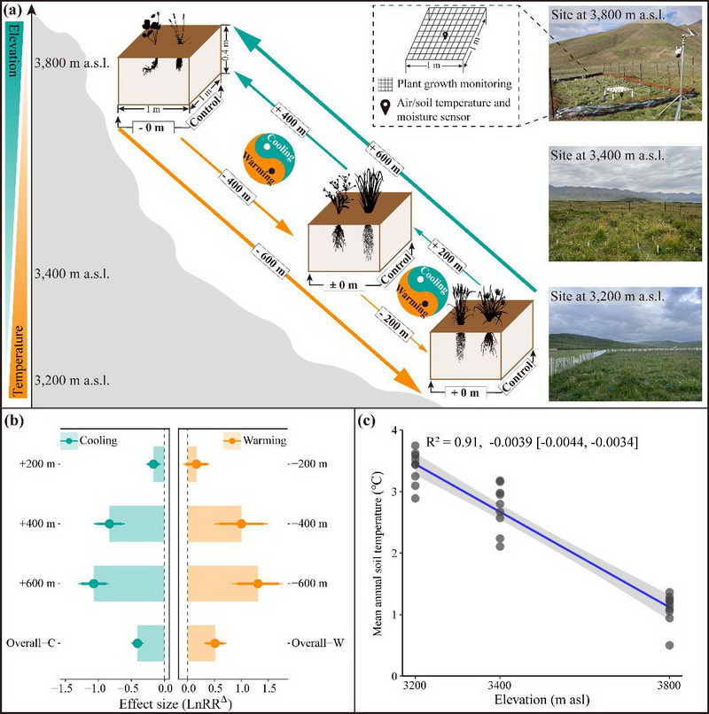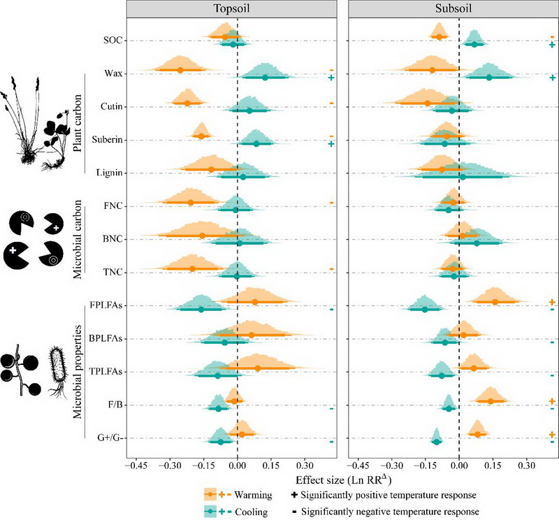 中國科學院西北高原生物研究所高寒生態(tài)系統(tǒng)與全球變化研究團隊依托2007年在青海海北高寒草地生態(tài)系統(tǒng)國家野外科學觀測研究站建立的“山體垂直帶雙向移栽實驗”平臺,基于生物標志物技術,并借助貝葉斯Meta統(tǒng)計分析在估計研究間異質性和合并效應量方面的優(yōu)勢(尤其在納入研究數(shù)量較少時)、獨特的后驗分布估計、靈活的參數(shù)設置和便利的結果圖形化展示方法等特點,創(chuàng)新性地采用貝葉斯Meta分析方法分析控制實驗數(shù)據(jù),對多組處理、對照實驗進行了歸納性總結,進而系統(tǒng)評估量化了增溫、降溫16年后高寒草甸表層(0-10 cm)和亞表層土壤(20-30 cm)有機碳含量的影響因素(包括植物生物量和多樣性、土壤理化性質、植物源碳組分,微生物源碳組分以及微生物群落特性等)的變化及其與有機碳含量的關系。