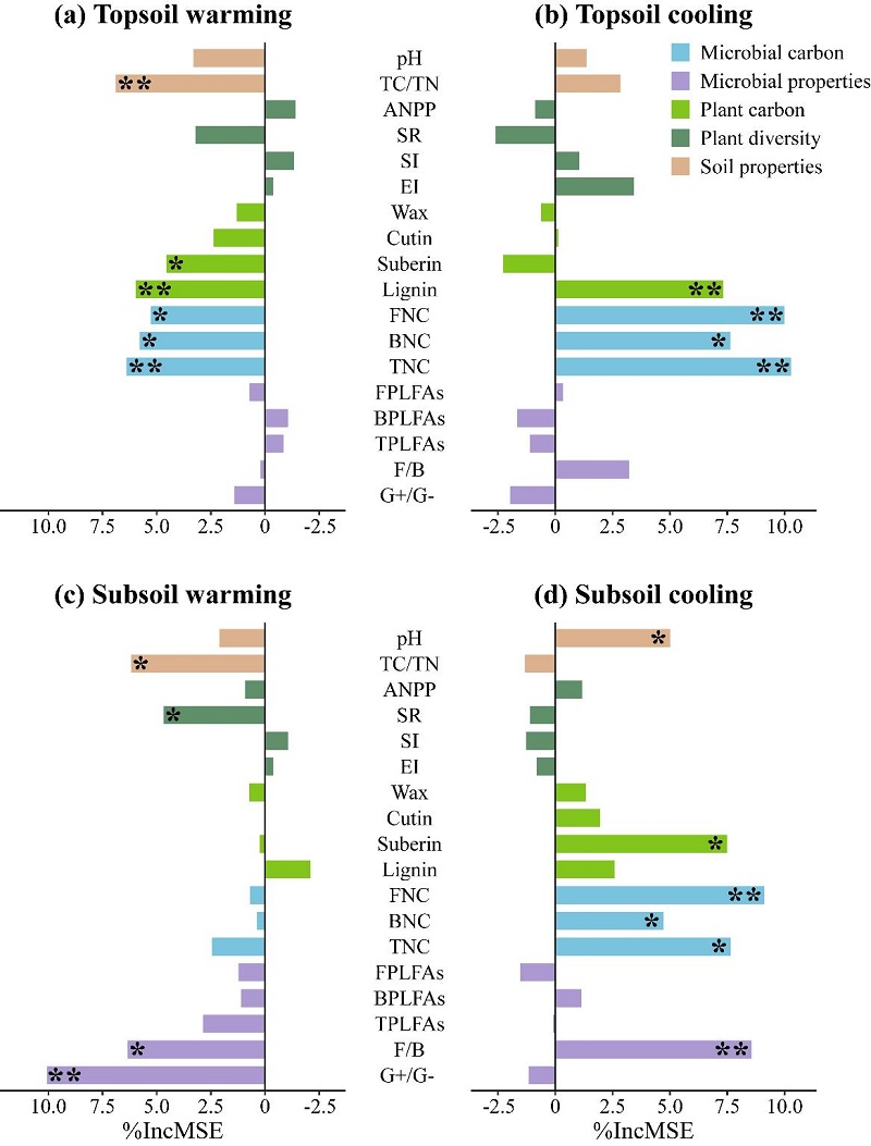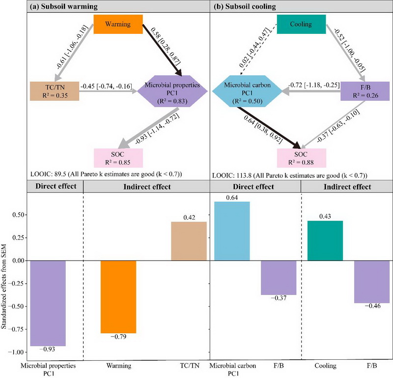 研究發(fā)現(xiàn),高寒草甸亞表層土壤有機碳對增溫、降溫的響應較表層更為敏感,無論是增溫還是降溫,均未引起亞表層土壤中植物和微生物源碳組分的顯著變化。然而,增溫使真菌與細菌生物量比值(F/B)和革蘭氏陽性細菌與革蘭氏陰性細菌生物量比值(G+/G-)分別增加15.0%和8.6%,而降溫則使其分別降低4.5%和9.6%。進一步分析發(fā)現(xiàn),增溫主要通過增加F/B和G+/G-直接減少土壤有機碳庫的積累,同時降低土壤碳氮比間接減少亞表層土壤有機碳含量,而降溫則主要通過降低F/B增加亞表層土壤有機碳含量。如果只考慮增溫而不考慮降溫的作用,傳統(tǒng)的增溫控制實驗可能會低估氣候變暖對高寒草地亞表層土壤有機碳庫的消極作用。該研究為更好地解釋和預測未來氣候變化背景下高寒草地生態(tài)系統(tǒng)土壤碳庫的形成與變化提供了新的理論依據(jù)。