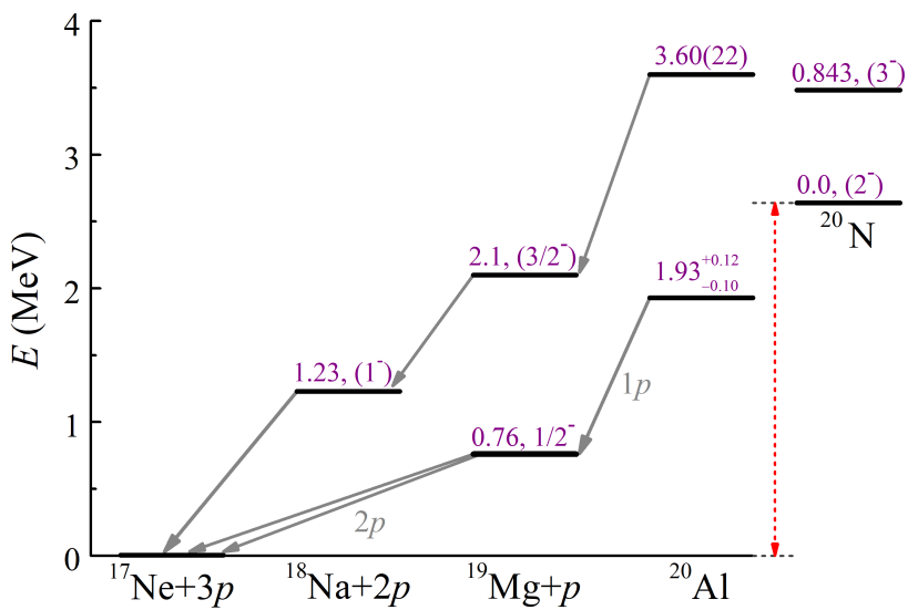 進(jìn)一步的研究表明,鋁-20基態(tài)通過(guò)級(jí)聯(lián)的質(zhì)子—雙質(zhì)子發(fā)射的兩步過(guò)程進(jìn)行衰變。作為中間態(tài)的鎂-19基態(tài)具有雙質(zhì)子放射性,它通過(guò)同時(shí)發(fā)射兩個(gè)質(zhì)子衰變?yōu)槟?/span>-17。鋁-20是實(shí)驗(yàn)上發(fā)現(xiàn)的首例具有“子核”雙質(zhì)子放射性的三質(zhì)子發(fā)射核。