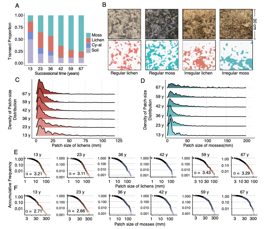 研究團隊采用了計算建模與全局-局部耦合的野外調(diào)查相結(jié)合的研究方法。理論建?;诟怕实脑詣訖C(Cellular automaton)模型的開發(fā),模擬了地衣和蘚類斑塊的動態(tài)變化。野外觀測在中國科學(xué)院沙坡頭沙漠試驗研究站進行,通過在不同演替階段的人工固沙植被帶中設(shè)置樣線,記錄了生物結(jié)皮的覆蓋度、組成和斑塊大小分布。研究通過對冪律分布的擬合,從全局尺度檢測主導(dǎo)生物結(jié)皮動態(tài)的反饋模式。通過不同演替階段和不同斑塊大小下生物結(jié)皮斑塊中心與邊緣之間的生長差異比較,從斑塊尺度驗證局部自組織過程,對比模擬結(jié)果揭示了生物結(jié)皮自組織機理及其生態(tài)意義。